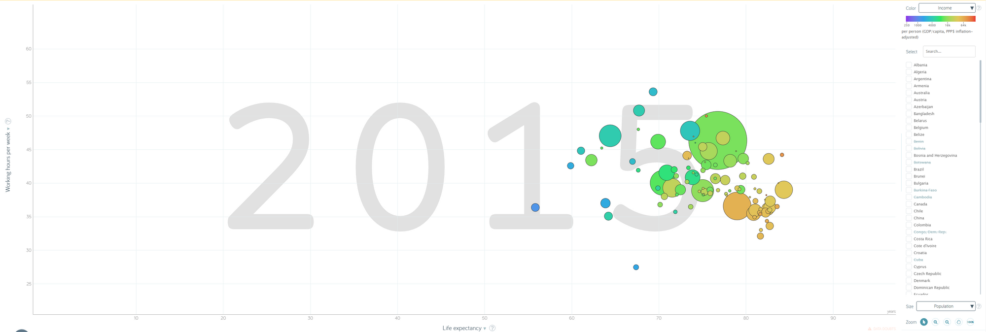 Aus dem Diagramm lassen sich die Lebenserwartung (X-Achse) und die durchschnittliche Arbeitszeit pro Woche (Y-Achse) ablesen. Anhand der Farbe wird durchschnittliche Einkommen dargestellt. Das Einkommen scheint gegensätzlich mit der Arbeitszeit zusammenzuhängen. Dies könnte sich dadurch erklären lassen, das Reiche Länder es weniger nötig haben viel zu Arbeiten, um ihren Lebensstandard zu finanzieren. Alternativ lässt sich auch feststellen, dass Reiche Länder längere Lebenserwartungen haben. Dies liegt möglicherweise daran, dass sie sich nicht so stark Überarbeiten müssen wie arme Länder.