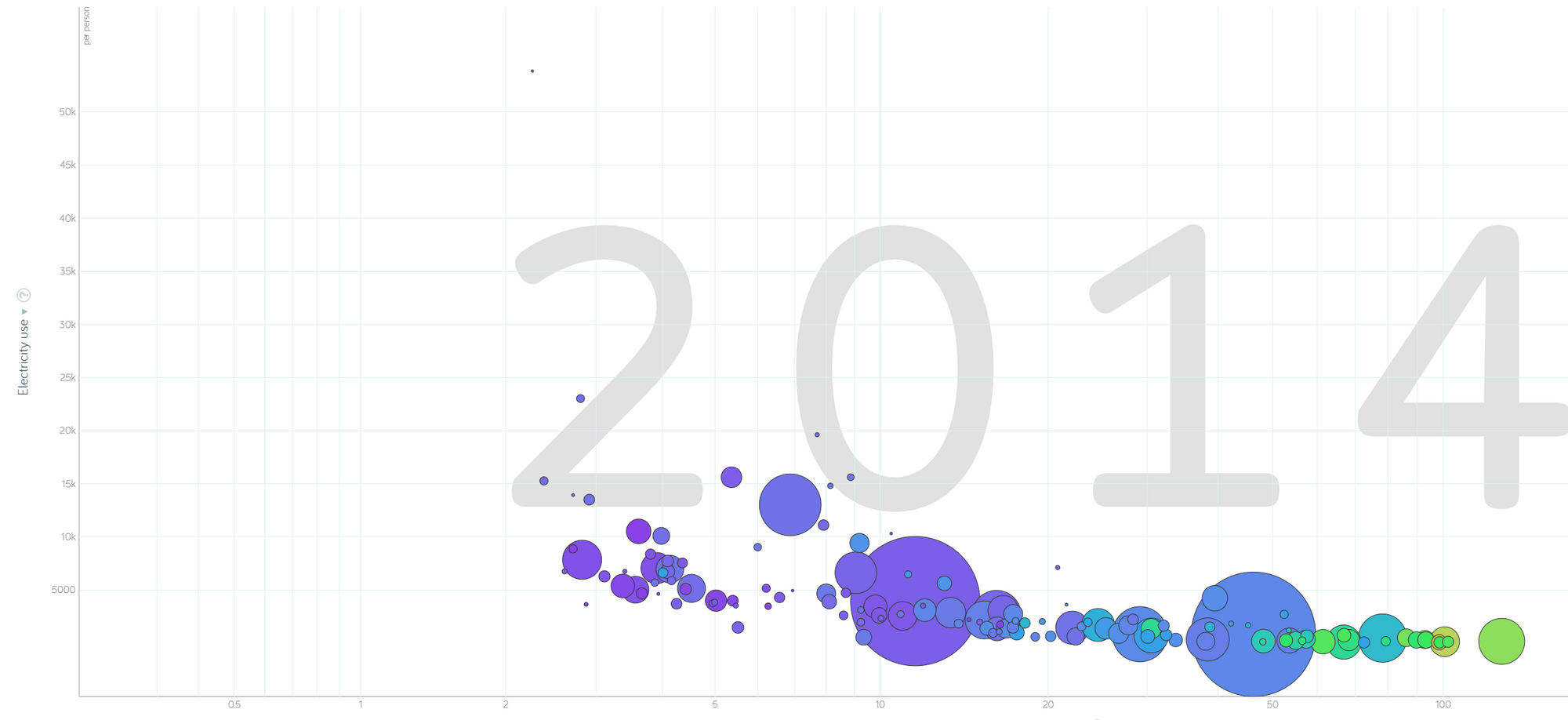 Dieses Diagramm stellt den Stromverbrauch eines Lands (Y-Achse) und die Sterblichkeitsrate von Kindern (X-Achse) da. Die Farbe stellt die durchschnittlichen Kinder einer Frau da. Der Zusammenhang zwischen geringer Kindersterblichkeit und höherem Stromverbrauch liegt vermutlich daran, dass Reiche Länder mehr Strom verbrauchen. Des weiteren lässt sich feststellen das Länder mit hoher Kindersterblichkeit auch oft viele Kinder pro Frau haben.