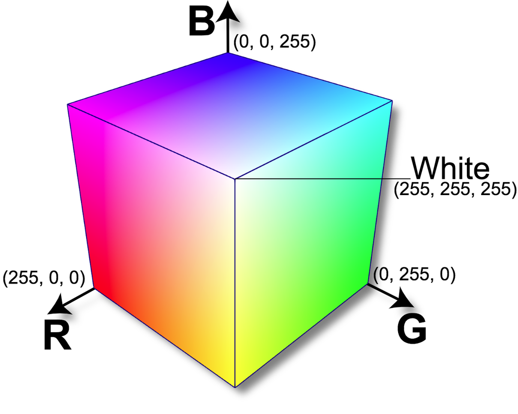 Der RGB-Farbwürfel hat seinen Ursprung bei Schwarz, da kein RGB meisten mit additiven Farb-Prozessen genutzt wird. Dies äußert sich dadurch, das Weiß durch RGB(255,255,255) abgebildet wird.