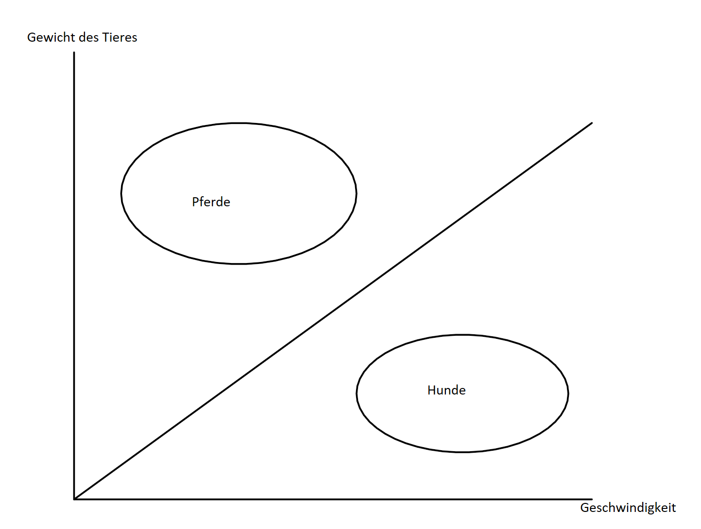 In meinem Beispiel werden Hunde und Pferde von einander unterschieden. Dies geschieht anhand des Verhältnisses zwischen der Geschwindigkeit (X-Achse) und des Gewichts des Tieres (Y-Achse).