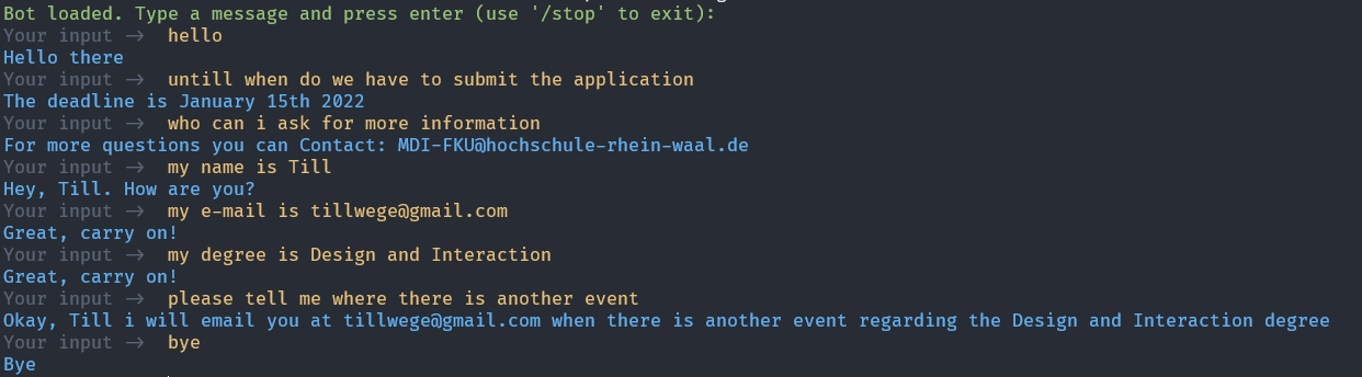 Bei diesem Chatbot geht es darum, Informationen des Nutzer abzufragen, und diesen über einige Fakten zu informieren. Hierzu können in Rasa zuerst die Rules verwendet werden, um auf spezifische Fragen mit festgelegten Antworten antworten zu können. So lassen sich fragen wie "An wen kann ich mich bei weiteren Fragen wenden?" leicht bearbeiten. Mithilfe von Slots lassen sich Informationen im Chatbot "zwischenspeichern". So ist es möglich, dass sich der Bot Bsp. den Namen und die Email-Adresse der Person die ihn benutzt merkt. Diese Daten können dann entweder in Späteren Ausgaben, oder für andere Prozesse (wie bsp. die Registrierung einer Newsletter) verwendet werden.