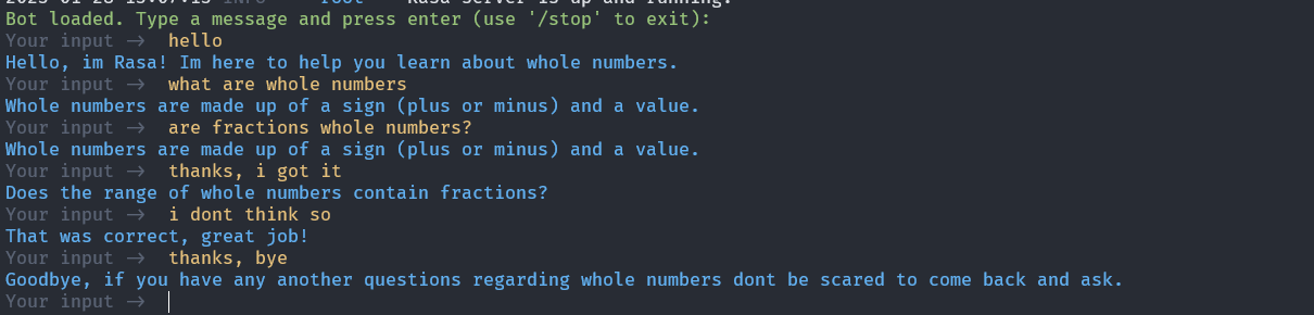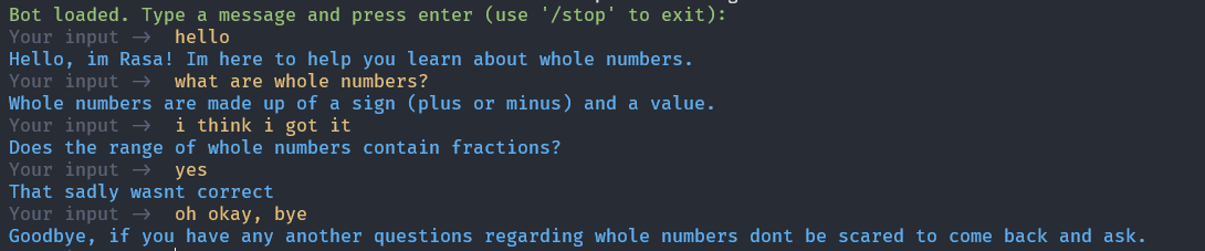 Dieser Bot soll das Rechnen mit natürlichen Zahlen erläutern. Hierzu kann er einzelne Fragen stellen, und auf die Antwort darauf reagieren. Hierbei ist es wichtig auf die Formulierungen die der Bot verwendet zu achten, da in diesem Kontext der Kontakt zwischen Chatbot und Mensch im schulischen Umfeld passieren soll. In meinem Fall habe ich den Bot nett und hilfreicht gestaltet, um den Schülern auch bei fehlschlägen ein möglichst guten Gefühl zu geben. So sollen Sie motiviert werden, auch bei falschen Antworten erneut zu versuchen das Thema zu verstehen.