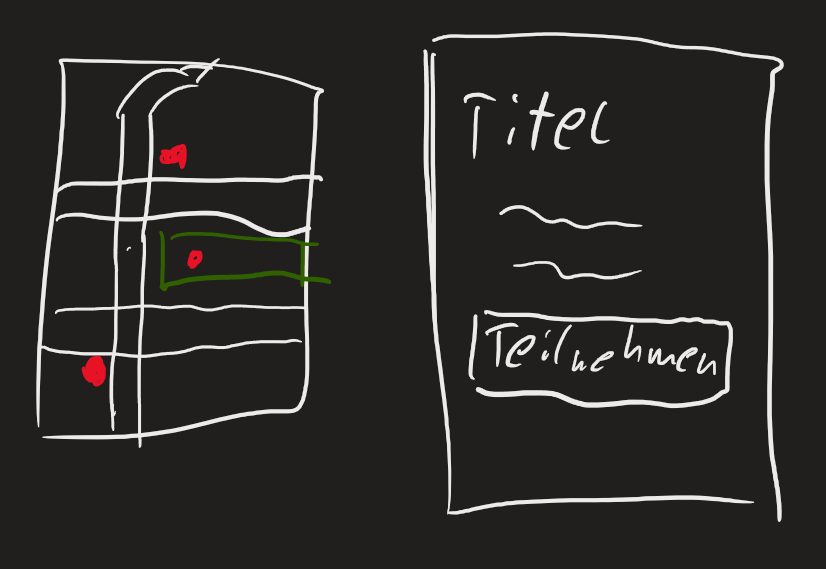 Die App zeigt dem Benutzer eine Karte seiner Umgebung auf welcher aktuelle oder bald eintretende Events angezeigt werden. Der Benutzer kann sich Informationen zum Event anschauen (Beispiele: Beschreibung, Ort, Aktivitäts-Art, Preis, etc.) und sich dafür anmelden und von der App an den Ort navigieren lassen.